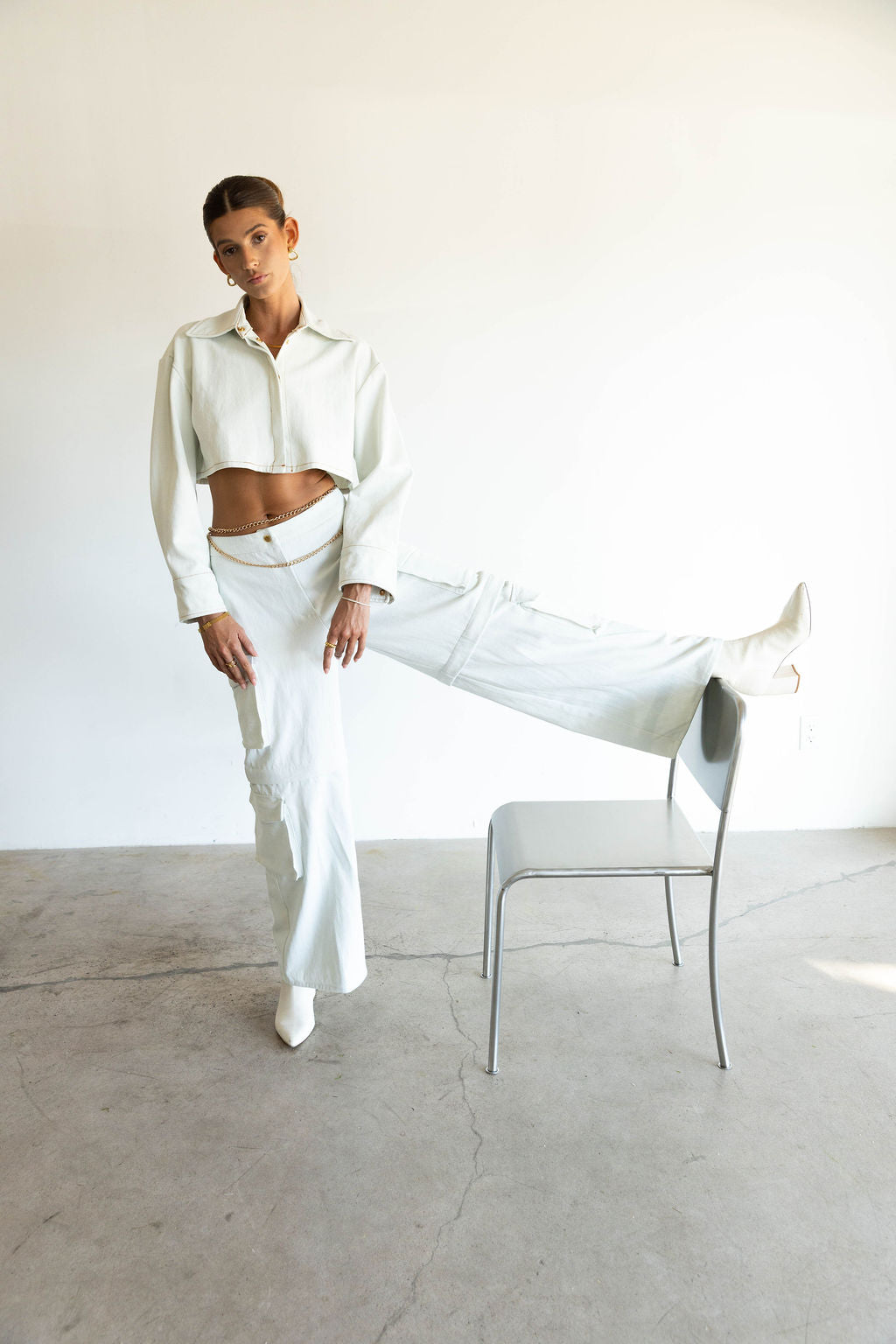 These denim convertible cargo pants are high waisted, wide leg, and zip off to cargo shorts!