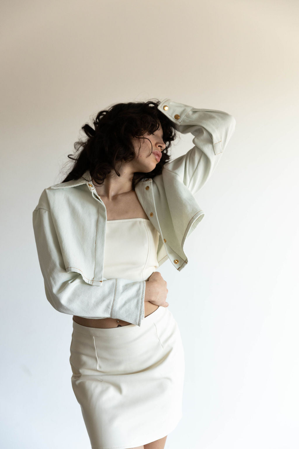 A chic faux leather mini skirt with soft suede backing. Designed with a high waist and fitted silhouette, finished with a bold gold zipper at the back. Simple, versatile, and effortlessly modern. 16"